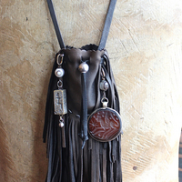 Artisan Made Leather Pouch and Fringe Necklace with Sterling Bead Closure