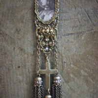Intricate Antique Gilt Finding with 2 inset faceted rhinestones - taken from an 18th century fan - an antique image of Joan of Arc (Jeanne D'Arc) has been placed beneath the finding with celluloid and covered in premium (soft!) suede leather.